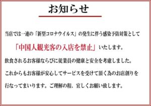 本日より「新型コロナウイルス」の発生に伴う感染予防対策として「ハレルヤ3店舗、まんざら、ねぎま」の全店舗「中国人観光客の入店を禁止」致します。