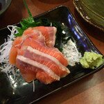幻と書かれた天然キングサーモンの、マスのお刺身と焼き鳥盛り合わせをまず注文しました。
