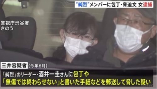 脅迫の疑いで逮捕されたのは、千葉県船橋市に住む職業不詳の三井由起子容疑者です。警視庁によりますと、三井容疑者は今年6月、ムード歌謡グループ「純烈」の事務所に刃物で切り刻んだ男性用下着や包丁、「あなたを無傷では終わらせません」「必ず事件にします」などと書いた脅迫文を送り、リーダーの酒井一圭さんを脅した疑いがもたれています。