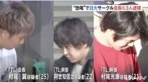恐喝の疑いで逮捕されたのは、日本大学のイベントサークル「TL」の会長・村尾翼容疑者(25)と幹部の村尾光康容疑者(21)、阿世知信治容疑者(22)の3人です。
