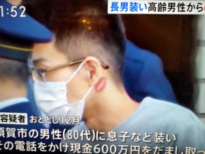 逮捕容疑は、静岡市葵区の無職、荒川楓被告(23)=本件の詐欺罪などで起訴、公判中=らと共謀のうえ、令和元年12月2日、神奈川県横須賀市に住む80代男性宅に、男性の長男を装って「会社のカネを使い込んでしまった。現金が必要。代わりの者が取りに行く」などと嘘の電話をかけ、翌3日、受け子役の男が男性宅を訪れ、現金600万円をだまし取ったなどとしている。