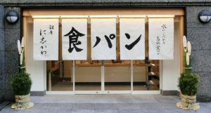 銀座に志かわの、のれんには「水にこだわる高級食パン」と書いてあります。