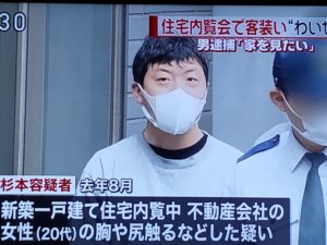 逮捕されたのは、大田区のアルバイト・杉本一郎容疑者(36)で、去年8月、大田区で販売中だった一戸建て住宅に客を装って訪れ、案内中の20代の女性係員の尻や胸を触った疑いがもたれています。女性は2階で尻を触られましたが、客の杉本容疑者に対し強く抵抗する事が出来ず、3階へ案内したところ今度は胸を触られたということです。