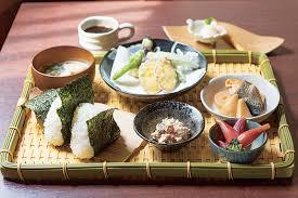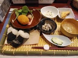 日替わりランチはバランスが良い和食と、おにぎり、お味噌汁がならびます。